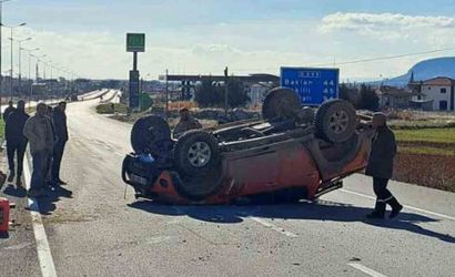 Denizli'nin Çivril ilçesi Denizli karayolunda seyir halinde olan bir pikap, yol düzlüğünde aks kırılması nedeniyle kontrolden çıkarak refüje çarptı ve takla attı.