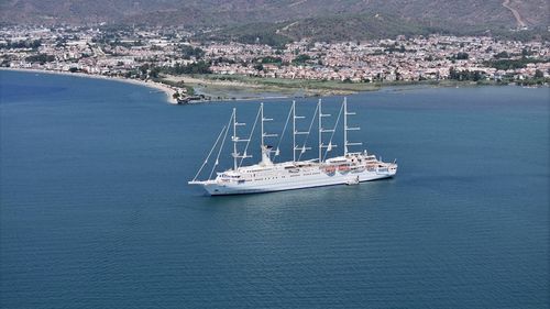 Fransa bayraklı yelkenli gemi Club Med 2, Rodos'tan gelerek Şövalye Adası önlerine demirledi; 283 turist küçük botlarla kıyıya taşındı, gemi akşam Antalya'ya hareket edecek.