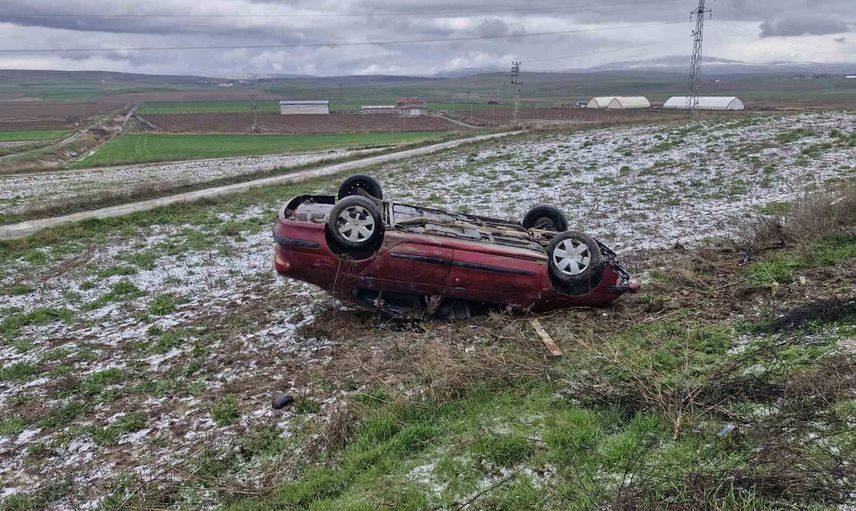 Çorum'un Alaca ilçesinde, Zile-Alaca kara yolunda seyir halinde olan bir otomobil, gizli buzlanma nedeniyle kontrolden çıkarak şarampolde ters döndü.