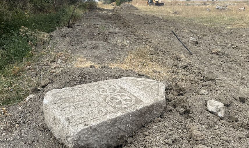 Çorum'un Alaca ilçesinde kepçe operatörünün kanal çalışması yaparken bulduğu, üzerinde haç ve yazıların bulunduğu, tarihi değeri olduğu düşünülen mezar taşı koruma altına alındı.