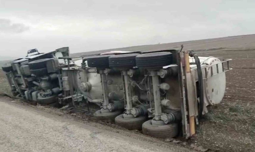 Sürücüsünün direksiyon hakimiyetini kaybettiği tanker, yol kenarındaki toprak alana yan yattı. Olayda 1 kişi yaralandı.