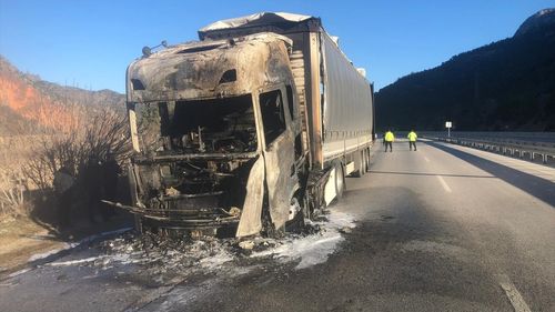 Çorum'un Osmancık ilçesinde seyir halindeki bir tır, motor bölümündeki yangın nedeniyle kullanılamaz hale geldi.