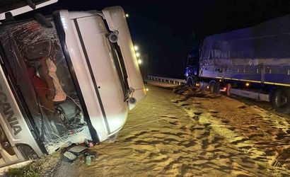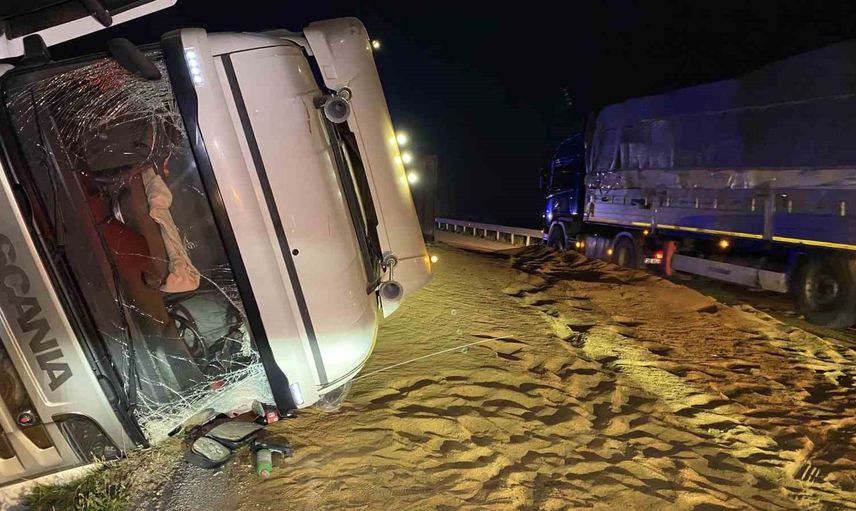 Çorum’da, Çorum-Samsun karayolunun 32. kilometresinde Umut Furkan A. idaresindeki 55 BK 143 plakalı Scania marka tırın devrilmesi sonucu yola hayvan yemi saçıldı. Kazada sürücü yaralanırken, dökülen yem nedeniyle yol ulaşıma kapandı.