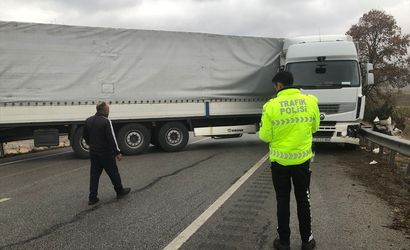 Çorum'da meydana gelen bir tır kazası, Çorum-Samsun kara yolunun 1 saat boyunca kapalı kalmasına yol açtı. Sürücüsü henüz belirlenemeyen 20-ES-868 yabancı plakalı tır, Elvan Çelebi Köprüsü yakınlarında makaslayarak bariyerlere çarptı.