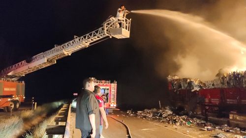 Çorum Sungurlu'da atık plastik yüklü tırda çıkan yangın söndürüldü