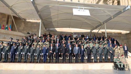 Cumhurbaşkanı Erdoğan, 8 Kasım Zafer Günü töreni için Azadlık Meydanı'na geldi; Bakü'de Haydar Aliyev Havalimanı'nda karşılandı ve Aliyev ile Şerif'le törene katıldı.