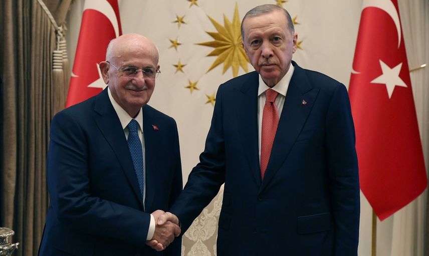 Cumhurbaşkanı Recep Tayyip Erdoğan (sağda), Cumhurbaşkanlığı Yüksek İstişare Kurulu Üyesi ve eski TBMM Başkanı İsmail Kahraman'ı (solda) Cumhurbaşkanlığı Külliyesi'nde kabul etti.