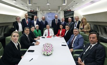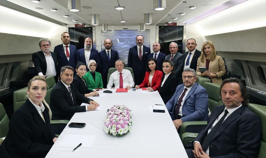 Cumhurbaşkanı Recep Tayyip Erdoğan, Arnavutluk ve Sırbistan'a gerçekleştirdiği resmi ziyaretlerin ardından Sırbistan’ın başkenti Belgrad’dan dönüşünde uçakta gazetecilere açıklamalarda bulundu ve soruları yanıtladı. Uçakta, Anadolu Ajansı (AA) Genel Müdür Yardımcısı ve Genel Yayın Yönetmeni Yusuf Özhan (ayakta sol 4) da yer aldı.