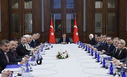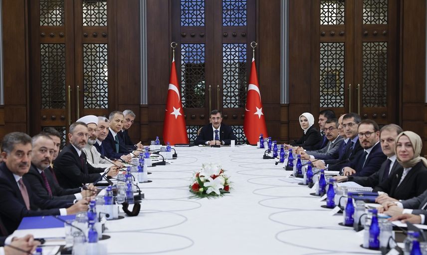 Bağımlılıkla Mücadele Yüksek Kurulu, Cumhurbaşkanı Yardımcısı Cevdet Yılmaz (ortada) başkanlığında toplandı. Cumhurbaşkanlığı Külliyesi'ndeki toplantıya, Aile ve Sosyal Hizmetler Bakanı Mahinur Özdemir Göktaş (sağ 8), Çevre, Şehircilik ve İklim Değişikliği Bakanı Murat Kurum (sağ 7), İçişleri Bakanı Ali Yerlikaya (sol 7), Milli Eğitim Bakanı Yusuf Tekin (sağ 6), Sağlık Bakanı Kemal Memişoğlu (sol 8), Ticaret Bakanı Ömer Bolat (sol 6), Cumhurbaşkanlığı İletişim Başkanı Fahrettin Altun (sol 4), Cumhurbaşkanlığı Strateji ve Bütçe Başkanı İbrahim Şenel (sağ 4), Yükseköğretim Kurulu Başkanı Erol Özvar (sağ 5), Diyanet İşleri Başkanı Ali Erbaş (sol 5) ve bazı bakan yardımcıları katıldı.