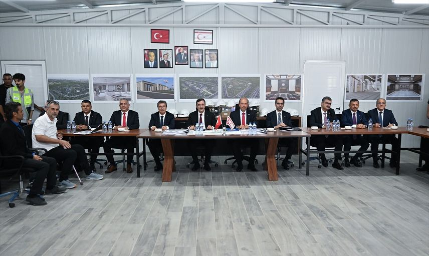 Cumhurbaşkanı Yardımcısı Cevdet Yılmaz (sağ 6), KKTC Cumhurbaşkanı Ersin Tatar (sağ 5), KKTC Başbakanı Ünal Üstel (sağ 7) ve Türkiye'nin Lefkoşa Büyükelçisi Yasin Ekrem Serim (sağ 4) ile birlikte KKTC Cumhurbaşkanlığı ve Cumhuriyet Meclisi binalarının inşaat alanında incelemelerde bulundu.