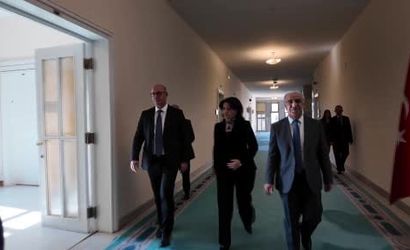 DEM Parti heyeti, AK Parti Grubu'nu TBMM'de ziyaret etti. AK Parti heyeti, konuk heyeti kapıda karşıladı.