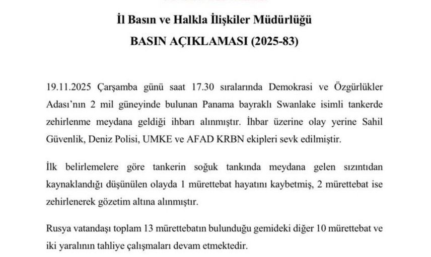 19 Kasım 2025 Çarşamba günü saat 17.30 sıralarında Demokrasi ve Özgürlükler Adası’nın 2 mil güneyinde demirli bulunan Panama bayraklı 'Swanlake' isimli tanker gemisinde bir zehirlenme olayı rapor edilmiştir. Olay sonucu 1 mürettebat hayatını kaybetmiş, 2 mürettebat zehirlenme nedeniyle gözetim altına alınarak hastaneye sevk edilmiştir.