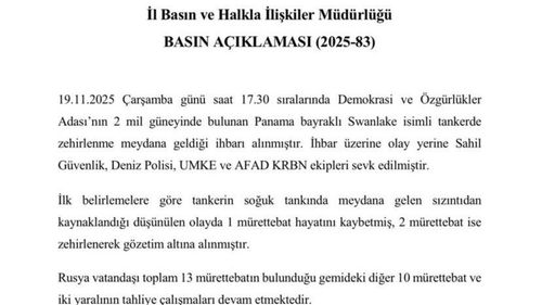 Demokrasi ve Özgürlükler Adası açıklarında 'Swanlake' tankerinde zehirlenme: 1 ölü, 2 kişi hastanedeOlayın özeti19 Kasım 2025 Çarşamba günü saat 17.30 sıralarında Demokrasi ve Özgürlükler Adası’nın 2 mil güneyinde demirli bulunan Panama bayraklı 'Swanlake' isimli tanker gemisinde bir zehirlenme olayı rapor…