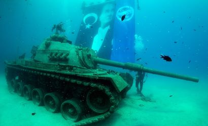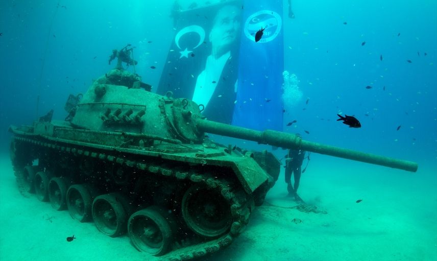 Antalya'nın Kaş ilçesinde 7 yıl önce dönemin Antalya Valisi Münir Karaloğlu'nun öncülüğünde turizmi çeşitlendirmek, dalış turizmine katkı sunmak için batırılan Türk Silahlı Kuvvetlerine (TSK) ait tankın bulunduğu bölgeye dalan Türkiye Sualtı Sporları Federasyonu dalgıçları ile su altı belgesel yapımcısı ve görüntü yönetmeni Tahsin Ceylan, 30 Ağustos Zafer Bayramı dolayısıyla Atatürk posteri, Türk bayrağı ve federasyon flaması açtı.