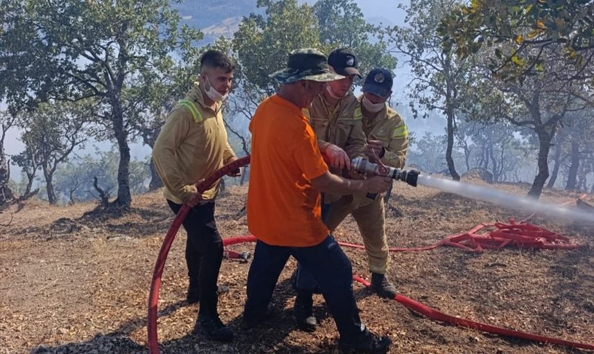 Denizli'nin Buldan ilçesinde, Çatak Mahallesi ile Aydın'ın Buharkent ilçesi Kızıldere Mahallesi arasında dün çıkan orman yangınını kontrol altına almak için çalışmalar devam ediyor.