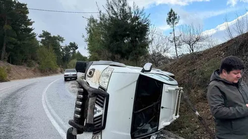 Denizli Çameli'de yağmur sonrası kayganlaşan yolda 20 AAF 334 plakalı pikap devrildi