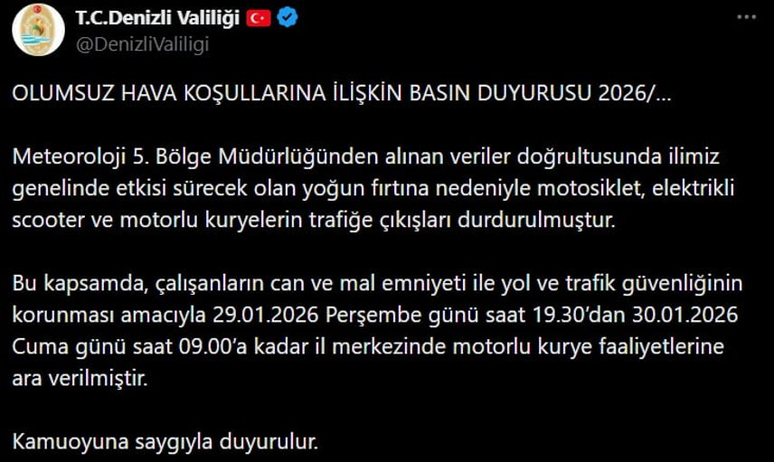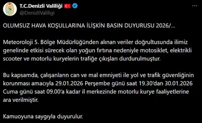 Valiliğin aldığı karar, açıklamada belirtildiği üzere can ve mal güvenliğinin sağlanması amacıyla uygulamaya konuldu. Karar süresince il merkezinde motorlu kurye hizmetlerinde aksama yaşanması olası olup, teslimat ve ulaşım düzenlemeleri etkilenebilir.