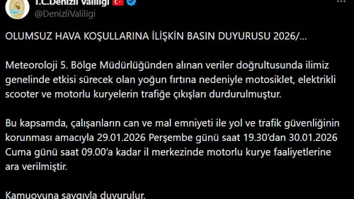 Denizli Valiliği, Meteoroloji verilerine dayanarak 29 Ocak 2026 19.30–30 Ocak 2026 09.00 arasında motosiklet, elektrikli scooter ve motorlu kurye trafiğini geçici olarak durdurdu.