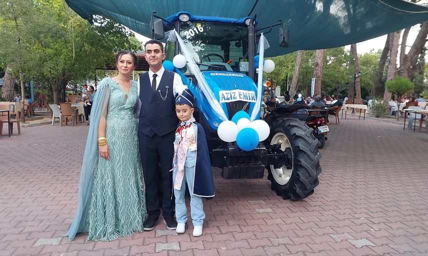 Denizli'nin Buldan ilçesinde, sıradışı bir sünnet düğünü gerçekleşti. Çiftçilik yapan Kenan ve Hanife Çiftçi çiftinin 8 yaşındaki oğulları Aziz Emir Çiftçi için düzenlenen sünnet töreninde, geleneksel araç yerine traktör tercih edildi.