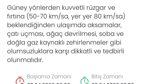 Meteoroloji, Denizli'de 2 Nisan 2026'de güney yönlerden kuvvetli rüzgar ve yer yer fırtına (50-70 yer yer 50-80 km/saat) beklendiğini bildirdi.