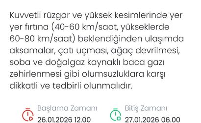 Uyarıda şu ifadelere yer verildi: Kuvvetli rüzgar ve yüksek kesimlerde yer yer fırtına (40-60 km/saat), yükseklerde (60-80 km/saat) beklendiğinden ulaşımda aksamalar, çatı uçması, ağaç devrilmesi, soba ve doğalgaz kaynaklı baca gazı zehirlenmesi gibi olumsuzluklara karşı dikkatli ve tedbirli olunmalıdır.