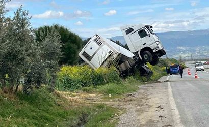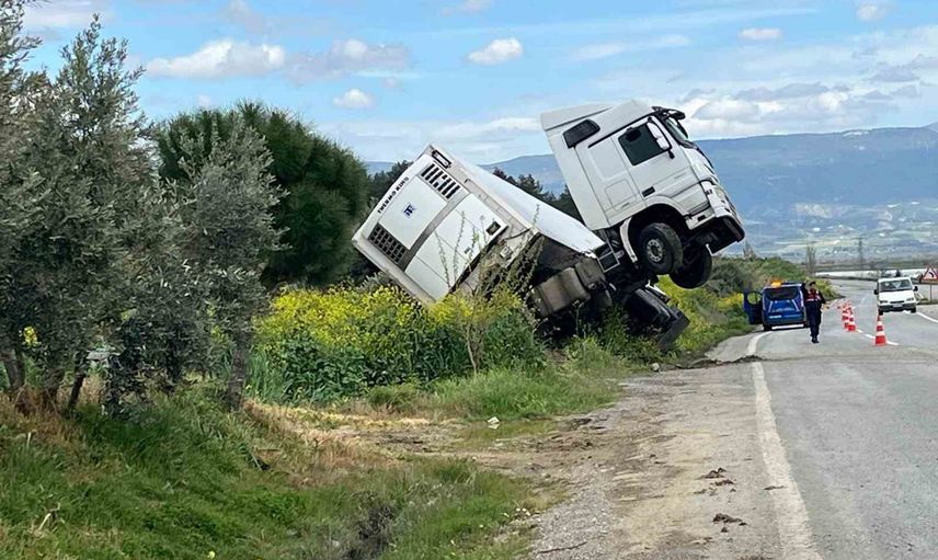 Denizli-Manisa karayolunda tır bağa girerek şaha kalktı
