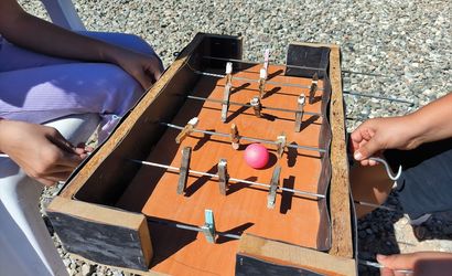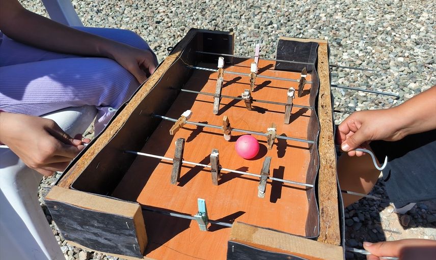 Öncelikle tahta bir kasa bulan Eylül, ardından kebap şişlerini kaseye sabitleyip çamaşır mandallarını futbolcu olarak kullandı. Eylül, yaptığı langırt ile kardeşiyle pinpon topuyla oynayarak zaman geçiriyor.