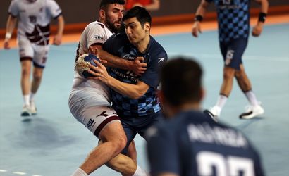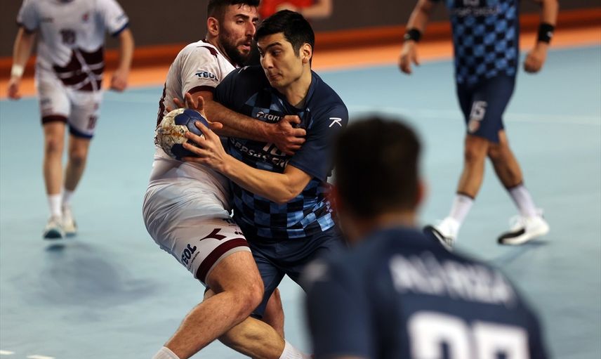 Hentbol Erkekler Süper Ligi'nin 18. haftasında Trabzon Büyükşehir Belediyespor ile DEPSAŞ Enerji, Beşirli Çok Amaçlı Spor Kompleksi'nde karşılaştı. Bir pozisyonda, Trabzon Büyükşehir Belediyespor oyuncusu Emirhan Aydemir (ortada) rakibi ile mücadele etti.