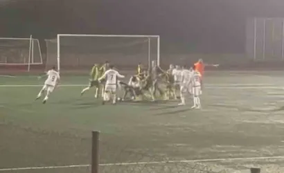 KOCAELİ’DE DERİNCE BİRLİK İLE BEYLİKBAĞI KARADENİZ ARASINDA OYNANAN KARŞILAŞMADA SAHA KARIŞTI. FUTBOLCULARIN BİRBİRLERİNE SALDIRDIĞI O ANLAR, TRİBÜNDEKİ BİR SEYİRCİ TARAFINDAN CEP TELEFONU KAMERASIYLA SANİYE SANİYE KAYDEDİLDİ.