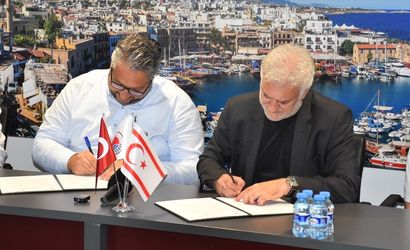 Devlet Tiyatroları (DT) Genel Müdürü Tamer Karadağlı (sağda) ile Girne Belediye Başkanı Murat Şenkul (solda) arasında Kıbrıs Türk tiyatrosunun geliştirilmesi, estetik ile etik değerlerinin güçlü kılınması için ortak çalışmalar düzenlenmesi ve tiyatro sanatının turizmin kültürel ve sanatsal boyutuna katkı sağlaması amacıyla işbirliği protokolü imzalandı.