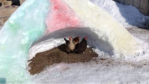 Ağrı'nın Diyadin ilçesinde vatandaşlar, yoğun kar ve soğukta sokak hayvanları için kardan barınaklar yapıp içlerini samanla döşedi; tavuklar ve bir kedi güvenli şekilde barındı.