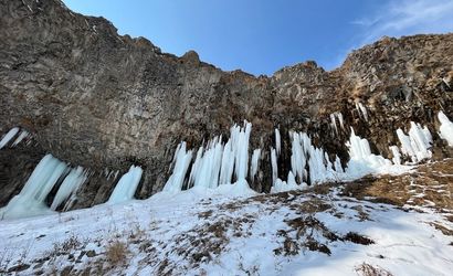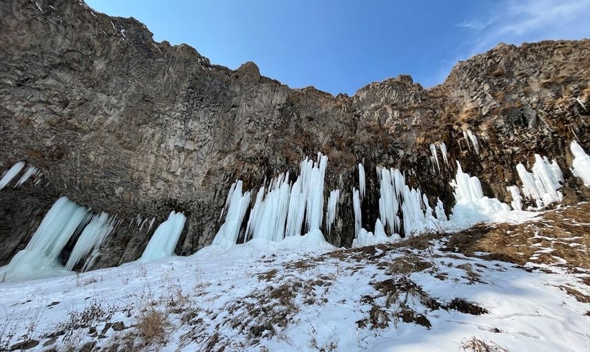 Ağrı'nın Diyadin ilçesindeki Murat Kanyonu'nda soğuk havanın etkisiyle metrelerce uzunlukta buz sarkıtları oluştu.