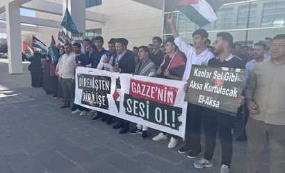 Öğrenci toplulukları adına konuşan Yusuf Güneş, Gazze'ye yönelik saldırıların tarihin en büyük insan hakları ihlallerinden biri haline geldiğini söyledi ve şöyle devam etti: 'Kadın, yaşlı, genç ve çocuk demeden 70 binden fazla masum insanın katledildiğini, hastanelerin, okulların, ibadethanelerin, BM tesislerinin bombalanması, sağlık personeli, gazeteci ve yardım görevlilerinin doğrudan hedef alınmasının uluslararası hukukun ve insanlığın tüm değerlerinin ayaklar altına alındığını göstermektedir. Gazze'de temel yaşam hakları yok edilmiş, insanlar açlık ve susuzlukla ölüme mahkum edilmiştir.'