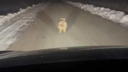 Diyarbakır Çınar'ın Haskaöy Mahallesi'ne inen bir kurt, kar yağışının ardından gece saatlerinde bir aracın önünde kilometrelerce koştu; anlar cep telefonu kamerasına yansıdı.