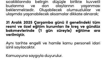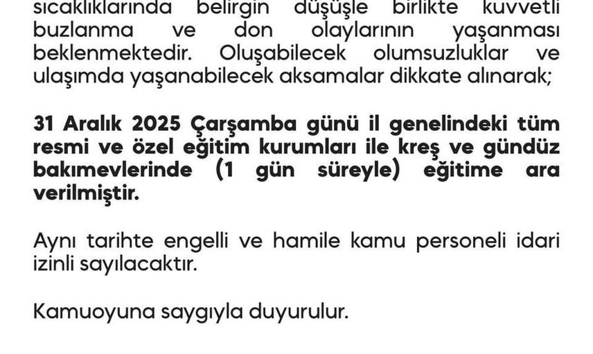 Oluşabilecek olumsuzluklar ve yaşanabilecek aksamalar dikkate alınarak, 31 Aralık Çarşamba günü il genelindeki tüm resmi ve özel eğitim kurumları ile kreş ve gündüz bakımevlerinde 1 gün süreyle eğitime ara verilmiştir.