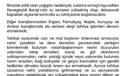 Devegeçidi Barajı'nda kontrollü su tahliyesi başlatılırken, Ergani, Pamukçay, Başlar, Kuruçay ve Ambar barajlarında serbest akışlı tahliye işlemleri devam etmektedir.