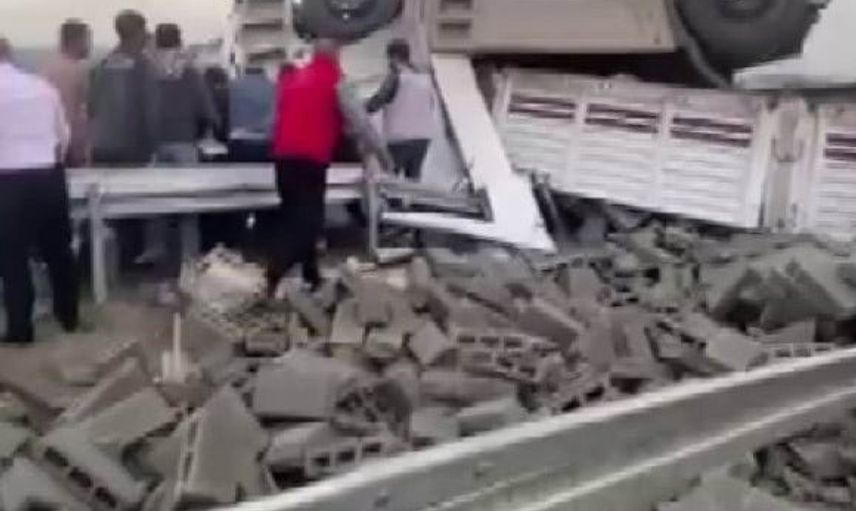Olay, Diyarbakır-Batman karayolu üzerinde gerçekleşti. Sürücüsünün direksiyon hakimiyetini kaybetmesi sonucu briket yüklü tır yan yattı ve yükteki briketler yola savruldu.