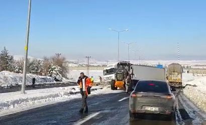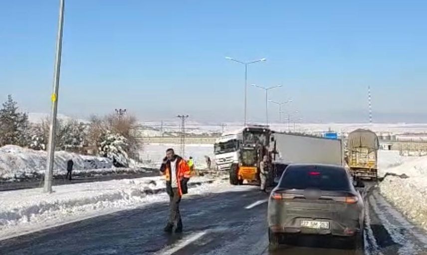 Diyarbakır’da kar yağışı sonrası oluşan buzlanma nedeniyle sürücüsünün direksiyon hakimiyetini kaybettiği bir tır yoldan çıktı.