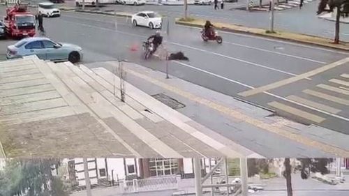Diyarbakır Bağlar'da yolun karşısına geçmeye çalışan kadına motosiklet çarpması sonucu yaya ve motosiklet sürücüsü olmak üzere 2 kişi yaralandı; kaza anı güvenlik kamerasına yansıdı.
