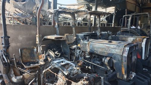 Diyarbakır'ın Huzurevleri Mahallesi'ndeki yangında 3 iş yeri ve birçok traktör kullanılamaz hale geldi. Yangının nedeni araştırılıyor.