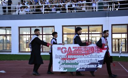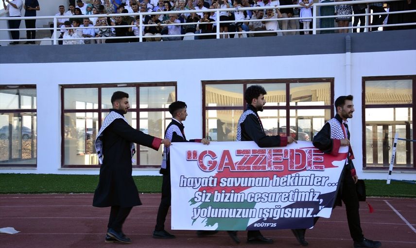 Törende bazı öğrencilerin boyunlarında Filistin atkısı taşıdığı ve "Özgür Filistin" sloganları attığı gözlemlendi. Öğrenciler, Gazze'deki insanlık dramına dikkat çekmek amacıyla çeşitli dövizler taşıdılar. Törende, "Önce vicdan sonra diploma, sağlıklı bir dünya için ilk reçetemiz: Özgür Filistin" ve "Filistin bizim onurumuzdur" yazılı pankartlar dikkat çekti.