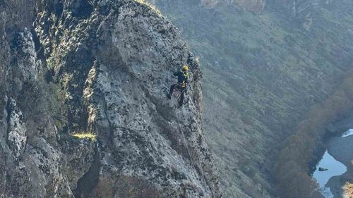 Diyarbakır'ın Eğil ilçesinde kayalıklarda mahsur kalan 25 keçi, itfaiye ekiplerinin halatla yaptığı müdahaleyle sahibine teslim edildi.