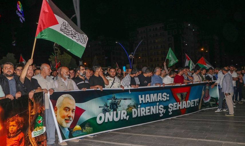 Elazığ'da El-Aksa Platformu ve diğer sivil toplum kuruluşlarının çağrısıyla 15 Temmuz Demokrasi Meydanı'nda bir araya gelen vatandaşlar, İsrail'in Küresel Sumud Filosu'na yönelik saldırısını kınadı. Katılımcılar Türk ve Filistin bayrakları taşıdı, tekbir getirdi ve İsrail karşıtı sloganlar seslendirdi.