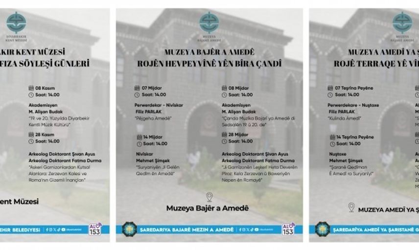 Diyarbakır Büyükşehir Belediyesi, Cemilpaşa Konağı Kent Müzesi geçici sergi salonunda Kasım ayı boyunca düzenlenecek 'kültürel hafıza söyleşileri' ile kent tarihine, müzikten mutfak kültürüne ve arkeolojik mirasa odaklanan bir program sunuyor. Etkinliklerde akademisyen, eğitimci, yazar ve arkeologlar konuşmacı olarak yer alacak.