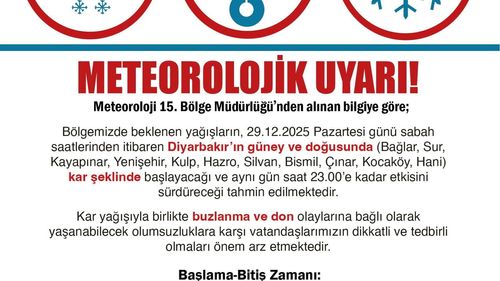 Meteoroloji 15’inci Bölge Müdürlüğü, Diyarbakır'ın bazı ilçelerinde yarın kar beklendiğini bildirdi; Valilik buzlanma ve don riskine karşı vatandaşları tedbirli olmaya çağırdı.