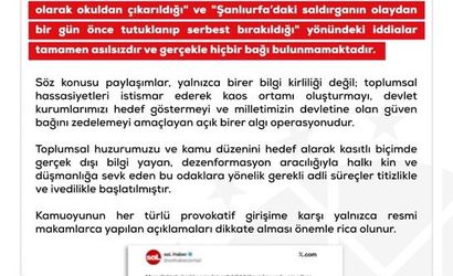 DMM açıklamasında, bazı basın yayın organları ve sosyal medya platformlarında yer alan; 'Kahramanmaraş’taki saldırganın polis eşliğinde sağ olarak okuldan çıkarıldığı' ve 'Şanlıurfa’daki saldırganın olaydan bir gün önce tutuklanıp serbest bırakıldığı' yönündeki iddiaların tamamen asılsız ve gerçekle hiçbir bağının bulunmadığı belirtildi.