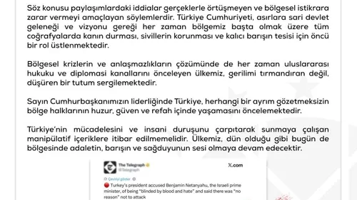 Dezenformasyonla Mücadele Merkezi, Cumhurbaşkanımıza atfedilen 'Türkiye’nin İsrail’e yönelik işgal tehdidi' iddialarını tamamen asılsız ilan etti; manipülatif içeriklere itibar edilmemeli.