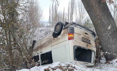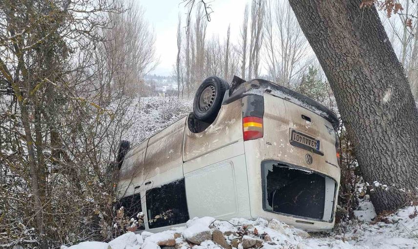 Kütahya’nın Domaniç ilçesinde meydana gelen kazada, gizli buzlanma nedeniyle kontrolden çıkan bir minibüs şarampole yuvarlandı ve takla attı. Araç, yol kenarındaki bir ağaca çarparak durabildi.