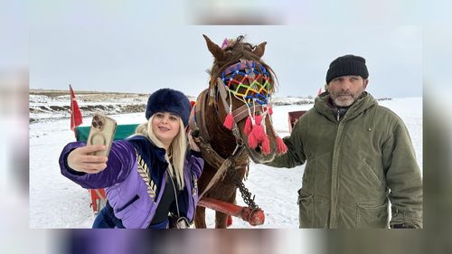 Ardahan ile Kars arasında kalan Çıldır Gölü'nün donmasıyla birlikte yerli ve yabancı turistler gölü gezmeye çıktı.