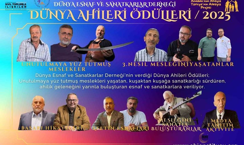 Dünya Esnaf ve Sanatkarlar Derneği - Ahi Enstitüsü tarafından geleneksel hale getirilen Dünya Ahileri Ödüllerinin 2025 edisyonu, 6 farklı kategoride toplam 12 esnaf ve sanatkarı ödüllendirdi. Ödüller, hem mesleki mirası koruyan ustaları hem de ekonomik zorluklar karşısında direniş sergileyen esnafı öne çıkarıyor.